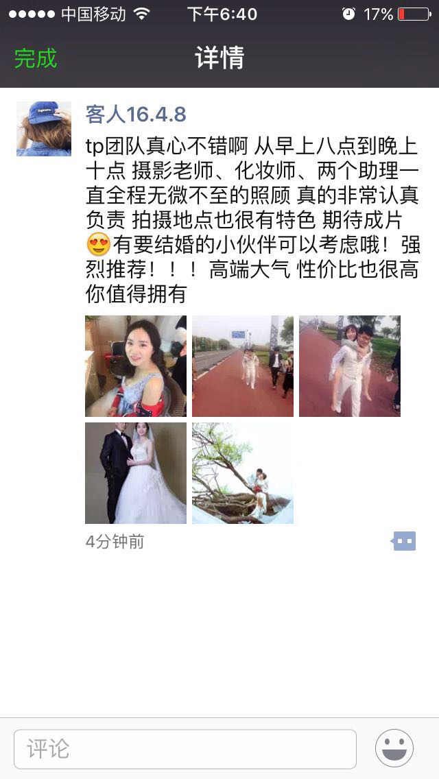 新新娘摄影团队真心不错啊。从早上八点到晚上十点摄影老师、化妆师、两个助理一直全程无微不至的照顾。真的非常认真